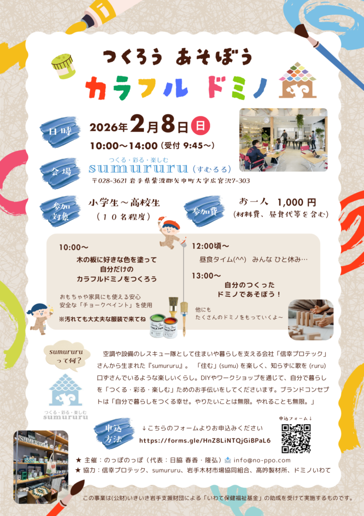 『sumururu』さんのご協力を得て、カラフルなドミノをつくって遊ぶワークショップを開催します![]()